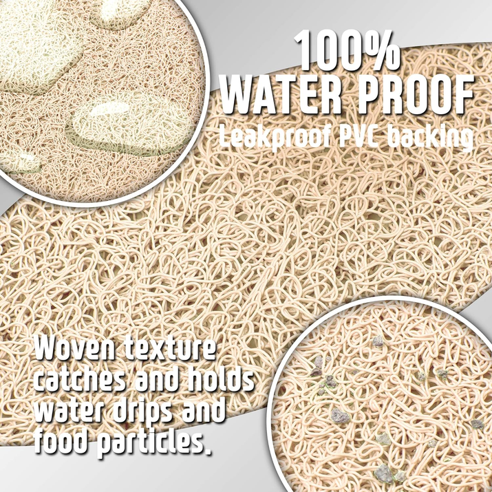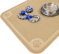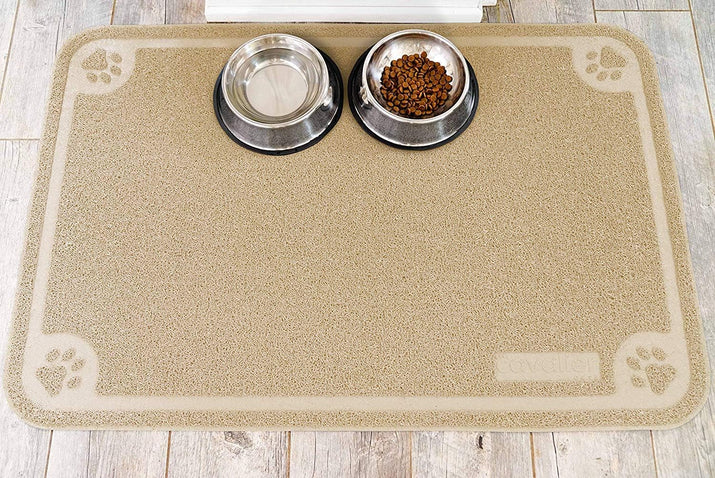 - UNIQUE EYE-CATCHING CRAFTY PAW DESIGN - This pet bowl mat matches perfect with any home decor because of its neutral beige color. It has four paws embedded on each corner of the mat giving this mat a nice fun and playful finishing touch.